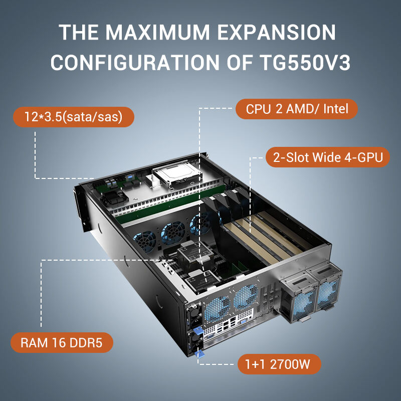 TG550V3 هو خادم GPU برجي من نوع 4U بـ 4 بطاقات يعتمد على الجيل الأحدث من معالجات Intel® Xeon® Scalable (الجيل 4/5)، يتميز بفعالية عالية من حيث التكلفة والأداء المتميز والقابلية العالية للتوسع والموثوقية العالية.