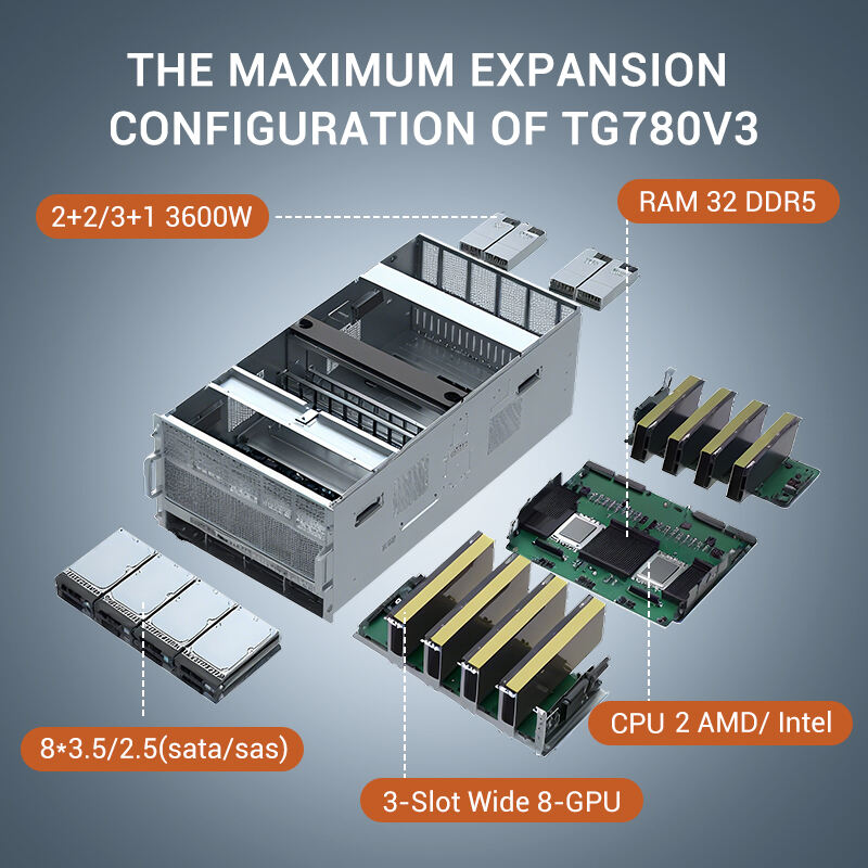 Το TG678V3 είναι ένας πολυσύνθετος εξυπηρετητής με 8 GPU, ο οποίος υποστηρίζει επεξεργαστές 4ης ή 5ης γενιάς Intel® Xeon® Scalable Processors και έως 8x 600W GPUs.